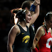 Ava Bayless is an honors student currently pursuing a Human Physiology major on the Pre Med track. A member of the program’s inaugural recruiting class, she has distinguished herself academically as a Big Ten Distinguished Scholar, Academic All-Big Ten honoree, NWCA Scholastic All American, and multiple time Dean’s List and President’s List recipient. Beyond athletics and academics, Ava is deeply committed to service, completing over 40 hours of community engagement in the fall of 2025 and representing Iowa on both the Student-Athlete Advisory Committee (SAAC)—where she serves on the Executive Committee—and the Big Ten Student-Athlete Issues Commission. Her service includes a three week immersion in rural Vietnam through Coach for College and leadership as Iowa’s first Team Impact Fellow, where she organized the university’s inaugural Team IMPACT 5K. Recognized for her impact, she is the University of Iowa’s female nominee for the Big Ten Jackie Robinson Community Impact Award.